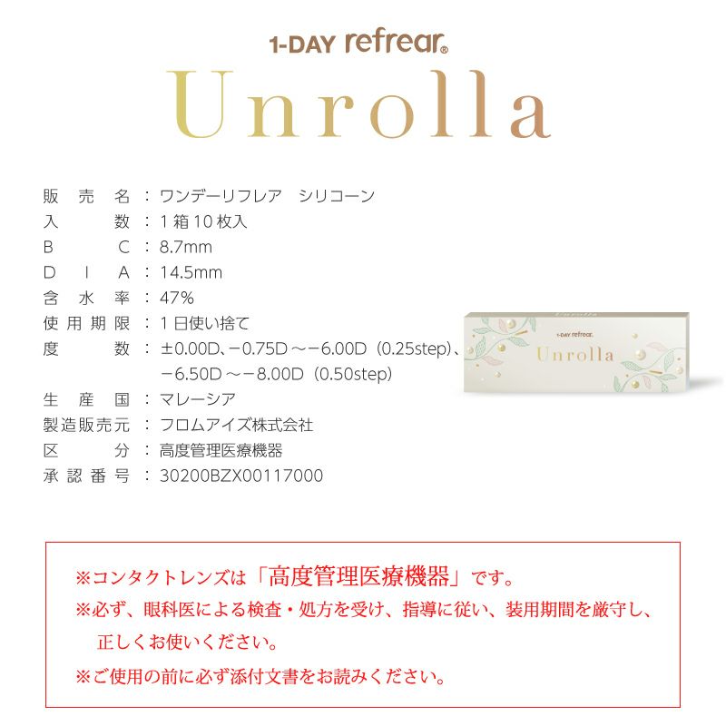 他の画像を見る 【即日発送OK♪】 Unrolla 1day silicone アンローラ シリコンハイドロゲル ルナンベージュ(1箱10枚入り) 送料無料 即日発送 ネコポス UVカット うるおい成分 シリコン ナチュラル 色素薄い系 水光 軸固定 ブラウン ベージュ 1day DIA14.5mm 着色直径13.1㎜ BC8.7mm 含水率47% フチあり 販売価格 ¥ 1,815 税込 カートに入れる お気に入りに登録する