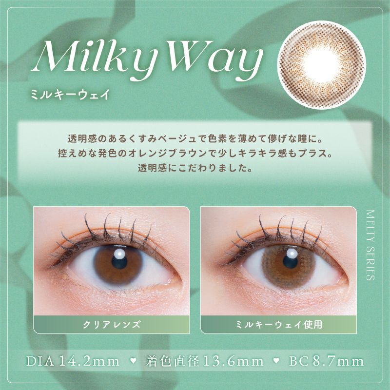 他の画像を見る 【即日発送OK♪】 お試し用♪LARME MELTY SERIES ラルムメルティシリーズ ミルキーウェイ(1箱2枚入り) 送料無料 即日発送 ネコポス UVカット うるおい成分 ナチュラル 色素薄い系 ブラウン 1day DIA14.2mm 着色直径13.6㎜ BC8.7mm 含水率58% 3箱同時購入で1箱分無料! 販売価格 ¥ 550 税込 カートに入れる お気に入りに登録する