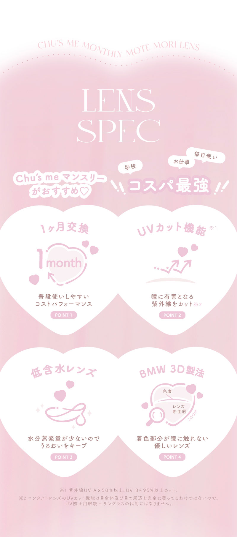 他の画像を見る 【即日発送OK♪】 Chu's me monthly チューズミーマンスリー モイストブラウン(1箱2枚入り) 送料無料 即日発送 ネコポス UVカット うるおい成分 ナチュラル 色素薄い系 ブラウン 1ヶ月 DIA14.2mm 着色直径13.5㎜ BC8.6mm 含水率38% フチあり 販売価格 ¥ 1,705 税込 カートに入れる お気に入りに登録する