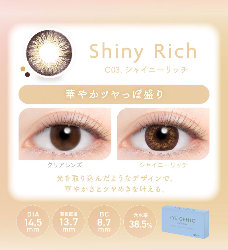 他の画像を見る 【即日発送OK♪】 【度あり】EYEGENIC by EverColor アイジェニック by エバーカラー シャイニーリッチ(1箱1枚入り) 送料無料 即日発送 ネコポス 度ありのみ ハーフ瞳 ブラウン 1ヶ月 DIA14.5mm 着色直径13.7㎜ BC8.7mm 含水率38.5% フチあり 販売価格 ¥ 825 税込 カートに入れる お気に入りに登録する