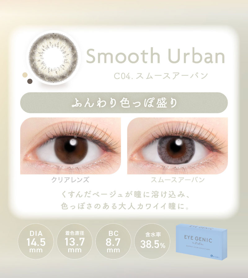 他の画像を見る 【即日発送OK♪】 《度なし》EYEGENIC by EverColor アイジェニック by エバーカラー スムースアーバン(1箱2枚入り) 送料無料 即日発送 ネコポス 度なしのみ ハーフ瞳 ブラウン 1ヶ月 DIA14.5mm 着色直径13.7㎜ BC8.7mm 含水率38.5% フチあり 販売価格 ¥ 1,650 税込 カートに入れる お気に入りに登録する