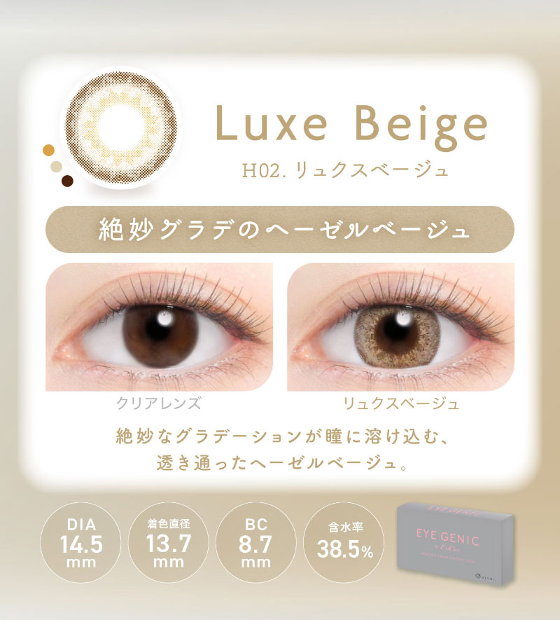 他の画像を見る 【即日発送OK♪】 《度なし》EYEGENIC by EverColor アイジェニック by エバーカラー リュクスベージュ(1箱2枚入り) 送料無料 即日発送 ネコポス 度なしのみ ハーフ瞳 ブラウン 1ヶ月 DIA14.5mm 着色直径13.7㎜ BC8.7mm 含水率38.5% フチあり 販売価格 ¥ 1,650 税込 カートに入れる お気に入りに登録する