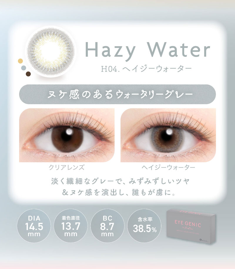 他の画像を見る 【即日発送OK♪】 《度なし》EYEGENIC by EverColor アイジェニック by エバーカラー ヘイジーウォーター(1箱2枚入り) 送料無料 即日発送 ネコポス 度なしのみ ハーフ瞳 グレー ブルー 1ヶ月 DIA14.5mm 着色直径13.7㎜ BC8.7mm 含水率38.5% 販売価格 ¥ 1,650 税込 カートに入れる お気に入りに登録する