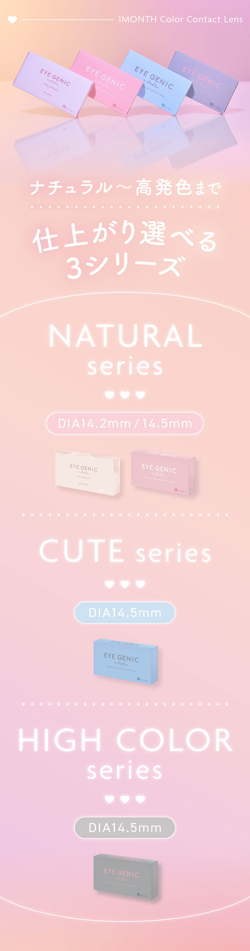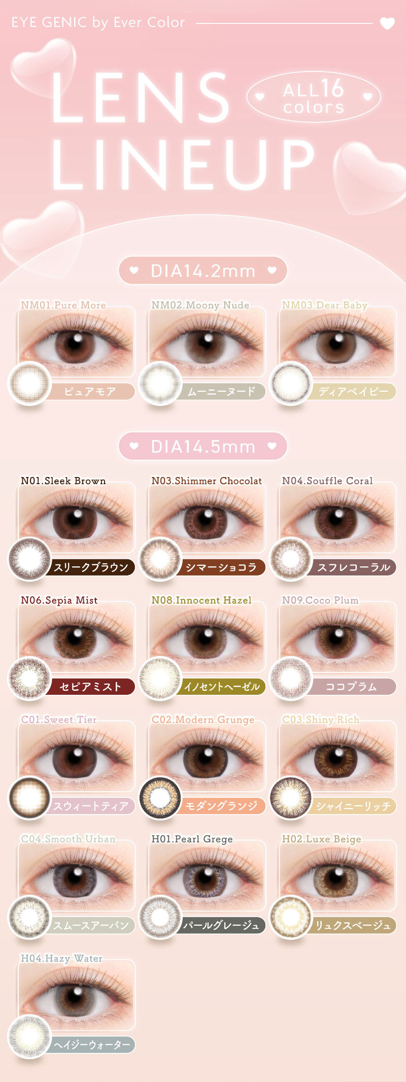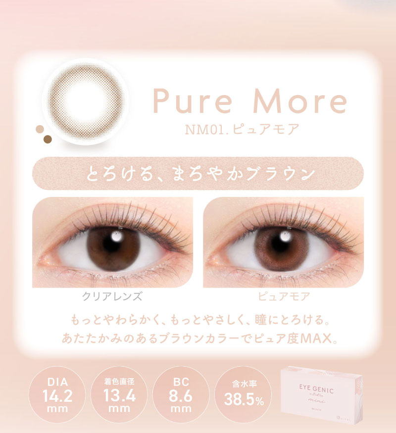他の画像を見る 【即日発送OK♪】 《度なし》EYEGENIC by EverColor アイジェニック by エバーカラー ピュアモア(1箱2枚入り) 送料無料 即日発送 ネコポス 度なしのみ ナチュラル ブラウン 1ヶ月 DIA14.2mm 着色直径13.4㎜ BC8.6mm 含水率38.5% フチあり 販売価格 ¥ 1,650 税込 カートに入れる お気に入りに登録する