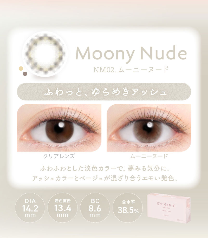 他の画像を見る 【即日発送OK♪】 《度なし》EYEGENIC by EverColor アイジェニック by エバーカラー ムーニーヌード(1箱2枚入り) 送料無料 即日発送 ネコポス 度なしのみ ナチュラル ブラウン 1ヶ月 DIA14.2mm 着色直径13.4㎜ BC8.6mm 含水率38.5% 販売価格 ¥ 1,650 税込 カートに入れる お気に入りに登録する