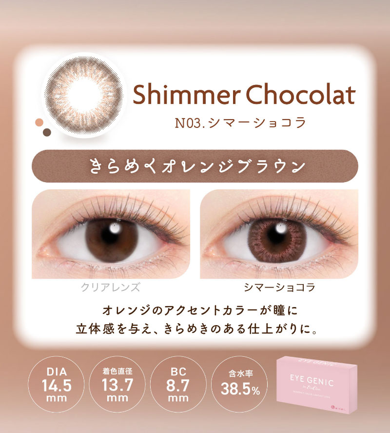 他の画像を見る 【即日発送OK♪】 《度なし》EYEGENIC by EverColor アイジェニック by エバーカラー シマーショコラ(1箱2枚入り) 送料無料 即日発送 ネコポス 度なしのみ ナチュラル ブラウン 1ヶ月 DIA14.5mm 着色直径13.7㎜ BC8.7mm 含水率38.5% フチあり 販売価格 ¥ 1,650 税込 カートに入れる お気に入りに登録する