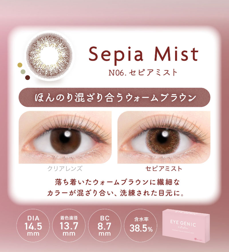 他の画像を見る 【即日発送OK♪】 《度なし》EYEGENIC by EverColor アイジェニック by エバーカラー セピアミスト(1箱2枚入り) 送料無料 即日発送 ネコポス 度なしのみ ナチュラル ブラウン 1ヶ月 DIA14.5mm 着色直径13.7㎜ BC8.7mm 含水率38.5% フチあり 販売価格 ¥ 1,650 税込 カートに入れる お気に入りに登録する