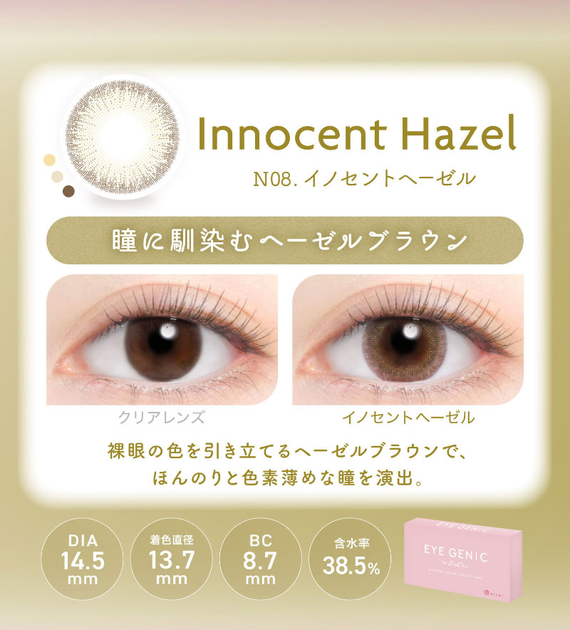 他の画像を見る 【即日発送OK♪】 《度なし》EYEGENIC by EverColor アイジェニック by エバーカラー イノセントヘーゼル(1箱2枚入り) 送料無料 即日発送 ネコポス 度なしのみ ハーフ瞳 色素薄い系 ブラウン 1ヶ月 DIA14.5mm 着色直径13.7㎜ BC8.7mm 含水率38.5% フチあり 販売価格 ¥ 1,650 税込 カートに入れる お気に入りに登録する