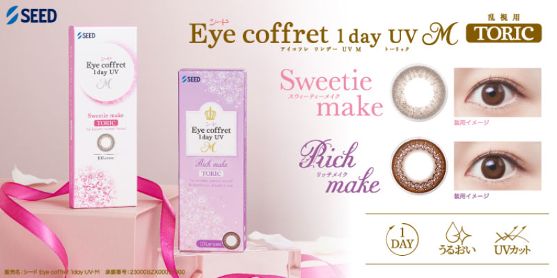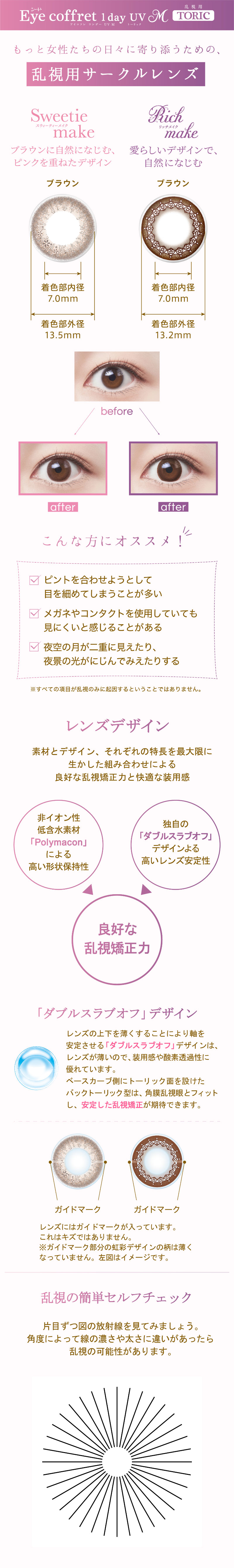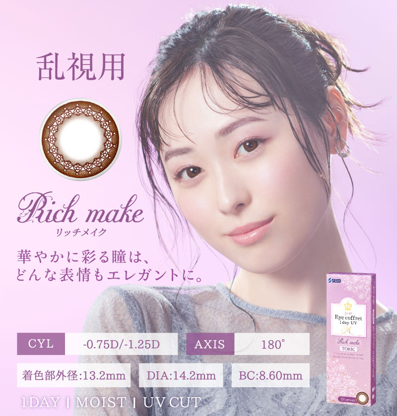 他の画像を見る 【即日発送NG】 【乱視用】Eye coffret 1day UV M アイコフレワンデーUV M Richmake リッチメイク -1.25D/180°(1箱10枚入り) 送料無料 ネコポス UVカット うるおい成分 乱視用 ナチュラル ブラウン 1day DIA14.2mm 着色直径13.2㎜ BC8.6mm 含水率38% 販売価格 ¥ 1,727 税込 カートに入れる お気に入りに登録する