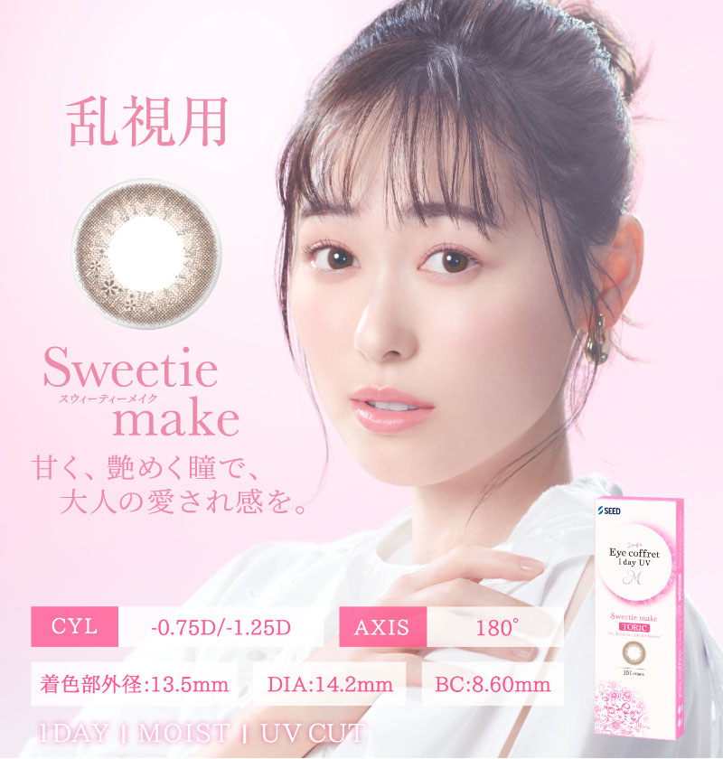 他の画像を見る 【即日発送NG】 【乱視用】Eye coffret 1day UV M アイコフレワンデーUV M Sweetiemake スウィーティーメイク -1.25D/180°(1箱10枚入り) 送料無料 ネコポス UVカット うるおい成分 乱視用 ナチュラル ブラウン 1day DIA14.2mm 着色直径13.5㎜ BC8.6mm 含水率38% 販売価格 ¥ 1,727 税込 カートに入れる お気に入りに登録する