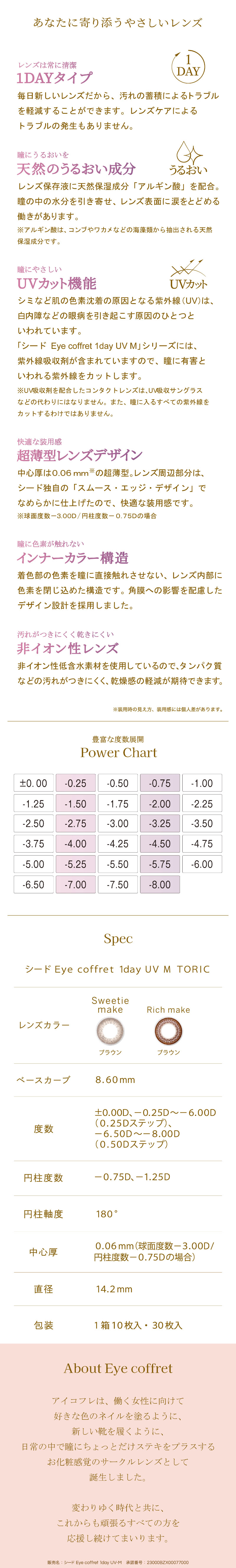 他の画像を見る 【即日発送NG】 【乱視用】Eye coffret 1day UV M アイコフレワンデーUV M Sweetiemake スウィーティーメイク -0.75D/180°(1箱10枚入り) 送料無料 ネコポス UVカット うるおい成分 乱視用 ナチュラル ブラウン 1day DIA14.2mm 着色直径13.5㎜ BC8.6mm 含水率38% 販売価格 ¥ 1,727 税込 カートに入れる お気に入りに登録する