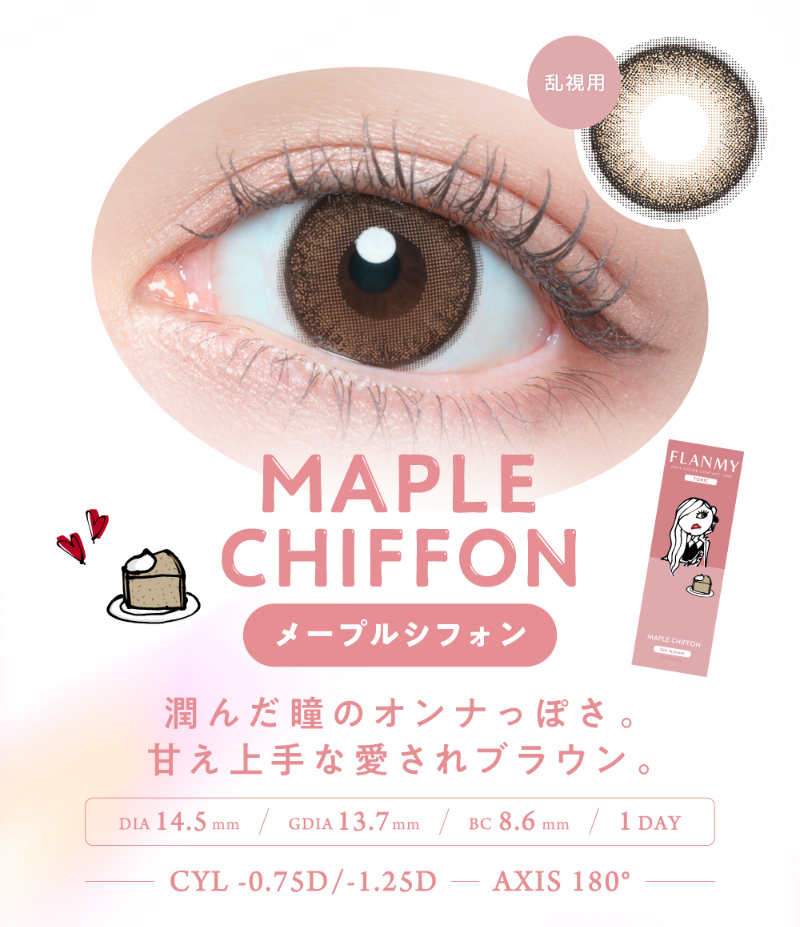 他の画像を見る 【即日発送OK♪】 【乱視用】FLANMY TORIC フランミートーリック メープルシフォン -1.25D/180°(1箱10枚入り) 送料無料 即日発送 UVカット うるおい成分 乱視用 ナチュラル ブラウン 1day DIA14.5mm 着色直径13.7㎜ BC8.6mm 含水率55% フチあり 販売価格 ¥ 1,815 税込 カートに入れる お気に入りに登録する