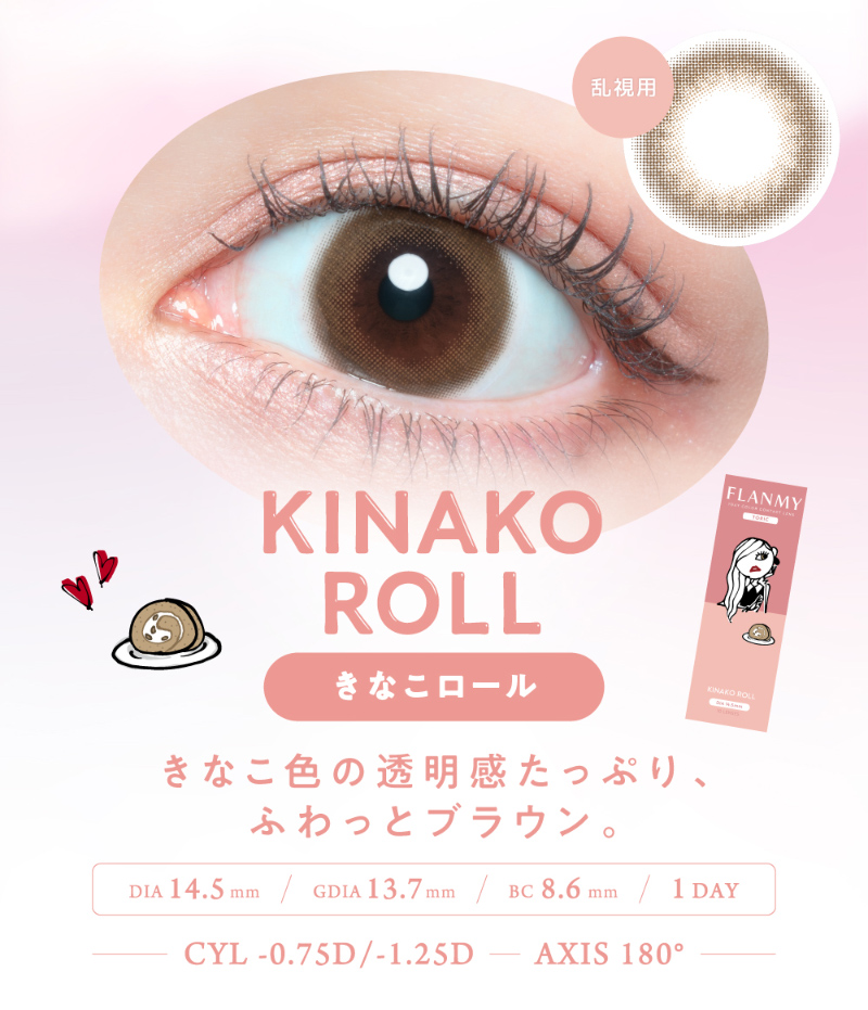 他の画像を見る 【即日発送OK♪】 【乱視用】FLANMY TORIC フランミートーリック きなこロール -1.25D/180°(1箱10枚入り) 送料無料 即日発送 UVカット うるおい成分 乱視用 ナチュラル ブラウン 1day DIA14.5mm 着色直径13.7㎜ BC8.6mm 含水率55% フチあり 販売価格 ¥ 1,815 税込 カートに入れる お気に入りに登録する