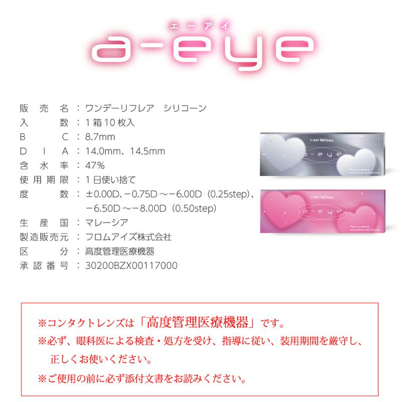 他の画像を見る 【即日発送OK♪】 お試し用♪a-eye 1day silicone エーアイ シリコンハイドロゲル ジェニーピンク(1箱2枚入り) 送料無料 即日発送 ネコポス UVカット うるおい成分 シリコン ナチュラル ハーフ瞳 色素薄い系 ピンク 1day DIA14.5mm 着色直径13.7㎜ BC8.7mm 含水率47% フチあり 3箱同時購入で1箱分無料! 販売価格 ¥ 550 税込 カートに入れる お気に入りに登録する