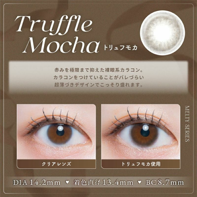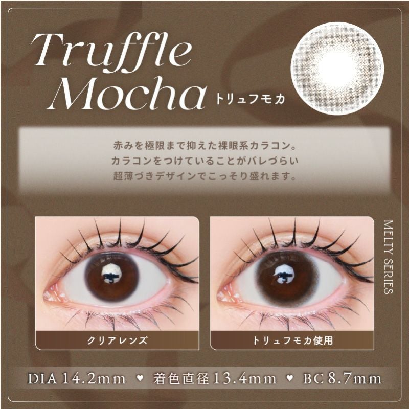 他の画像を見る 【即日発送OK♪】 LARME MELTY SERIES ラルムメルティシリーズ トリュフモカ(1箱10枚入り) 送料無料 即日発送 ネコポス UVカット うるおい成分 ナチュラル 色素薄い系 ブラウン 1day DIA14.2mm 着色直径13.4㎜ BC8.7mm 含水率58% フチあり 3箱同時購入で1箱分無料! 販売価格 ¥ 1,760 税込 カートに入れる お気に入りに登録する