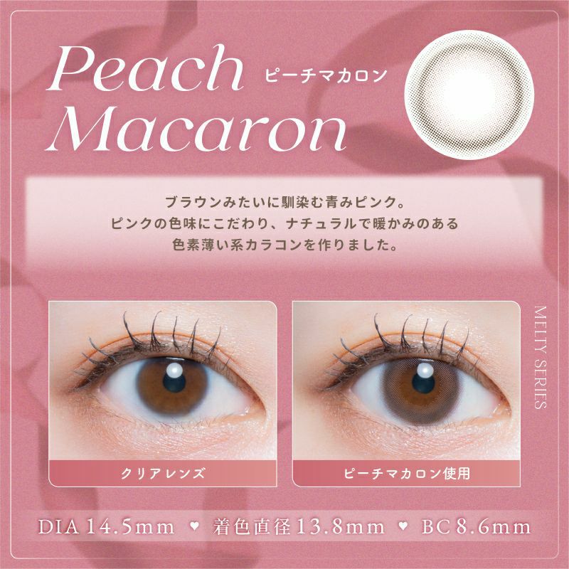 他の画像を見る 【即日発送OK♪】 LARME MELTY SERIES ラルムメルティシリーズ ピーチマカロン(1箱10枚入り) 送料無料 即日発送 ネコポス UVカット うるおい成分 ナチュラル 色素薄い系 ブラウン ピンク 1day DIA14.5mm 着色直径13.8㎜ BC8.6mm 含水率58% フチあり 3箱同時購入で1箱分無料! 販売価格 ¥ 1,760 税込 カートに入れる お気に入りに登録する