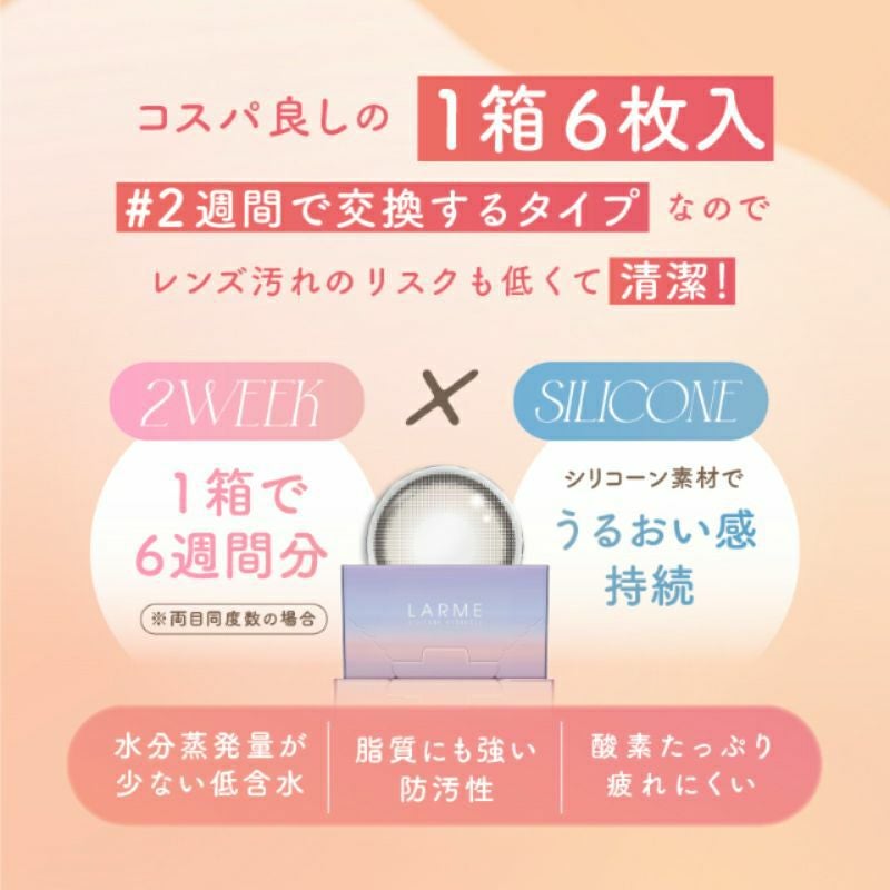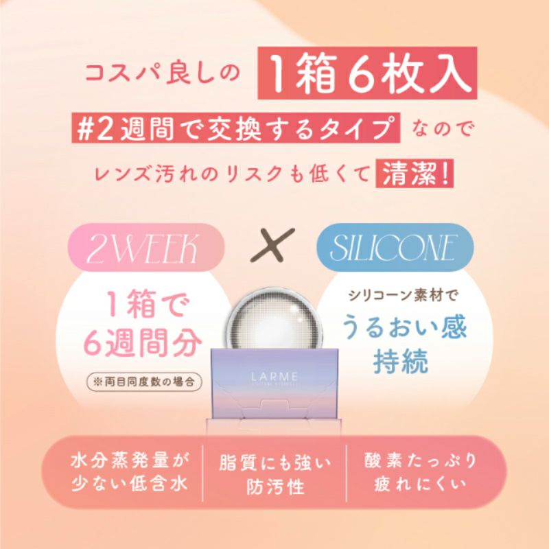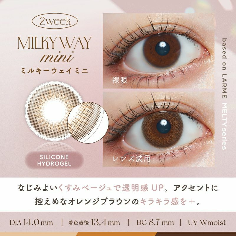 他の画像を見る 【即日発送OK♪】 LARME 2week Silicone ラルム 2ウィークシリコーン ミルキーウェイミニ(1箱6枚入り) 送料無料 即日発送 ネコポス UVカット うるおい成分 シリコン ナチュラル 色素薄い系 ブラウン 2week 1ヶ月 DIA14.0mm 着色直径13.4㎜ BC8.7mm 含水率47% フチあり 販売価格 ¥ 2,090 税込 カートに入れる お気に入りに登録する