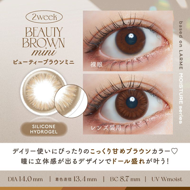 他の画像を見る 【即日発送OK♪】 LARME 2week Silicone ラルム 2ウィークシリコーン ビューティーブラウンミニ(1箱6枚入り) 送料無料 即日発送 ネコポス UVカット うるおい成分 シリコン ナチュラル ブラウン 2week 1ヶ月 DIA14.0mm 着色直径13.4㎜ BC8.7mm 含水率47% フチあり 販売価格 ¥ 2,090 税込 カートに入れる お気に入りに登録する