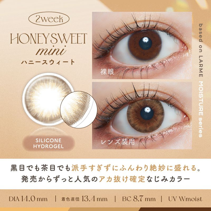 他の画像を見る 【即日発送OK♪】 LARME 2week Silicone ラルム 2ウィークシリコーン ハニースウィートミニ(1箱6枚入り) 送料無料 即日発送 ネコポス UVカット うるおい成分 シリコン ナチュラル ハーフ瞳 色素薄い系 ブラウン 2week 1ヶ月 DIA14.0mm 着色直径13.4㎜ BC8.7mm 含水率47% フチあり 販売価格 ¥ 2,090 税込 カートに入れる お気に入りに登録する