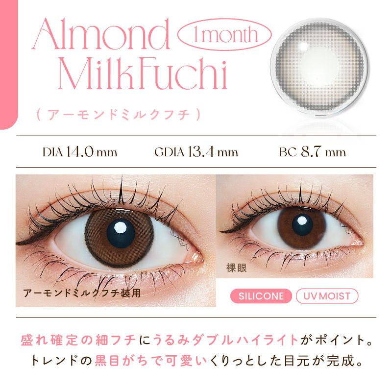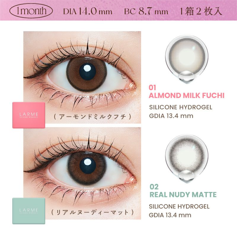 他の画像を見る 【在庫限りで終売】 LARME 1month Silicone ラルム ワンマンス シリコーン アーモンドミルクフチ(1箱2枚入り) 送料無料 即日発送 ネコポス UVカット うるおい成分 シリコン ナチュラル ブラウン 1ヶ月 DIA14.0mm 着色直径13.4㎜ BC8.7mm 含水率47% フチあり 販売価格 ¥ 1,650 税込 カートに入れる お気に入りに登録する