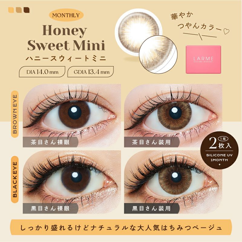 他の画像を見る 【在庫限りで終売】 LARME 1month Silicone ラルム ワンマンス シリコーン ハニースウィートミニ(1箱2枚入り) 送料無料 即日発送 ネコポス UVカット うるおい成分 シリコン ナチュラル ハーフ瞳 色素薄い系 ブラウン 1ヶ月 DIA14.0mm 着色直径13.4㎜ BC8.7mm 含水率47% フチあり 販売価格 ¥ 1,100 税込 カートに入れる お気に入りに登録する