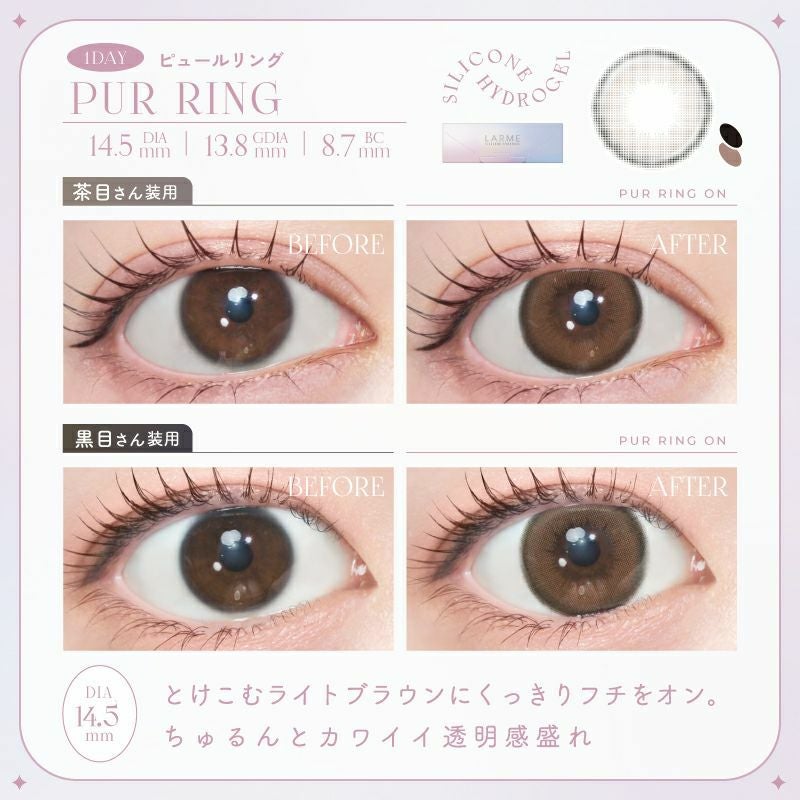 他の画像を見る 【即日発送OK♪】 LARME ラルムシリコンハイドロゲルダブルモイストUV ピュールリング (1箱10枚入り) 送料無料 即日発送 ネコポス UVカット うるおい成分 シリコン ナチュラル 色素薄い系 ブラウン 1day DIA14.5mm 着色直径13.8㎜ BC8.7mm 含水率47% フチあり 3箱同時購入で1箱分無料! 販売価格 ¥ 1,760 税込 カートに入れる お気に入りに登録する