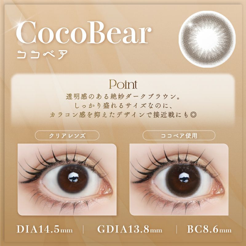 他の画像を見る 【即日発送OK♪】 LARME NATURAL ラルムナチュラル ココベア(1箱20枚入り) 送料無料 即日発送 ネコポス UVカット うるおい成分 ナチュラル 色素薄い系 ブラウン 1day DIA14.5mm 着色直径13.8㎜ BC8.6mm 含水率58% フチあり 3箱同時購入で1箱分無料! 販売価格 ¥ 2,596 税込 カートに入れる お気に入りに登録する