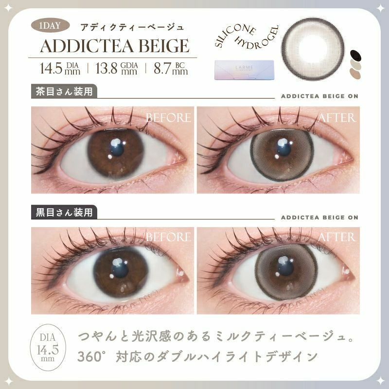 他の画像を見る 【即日発送OK♪】 LARME 2week Silicone ラルム 2ウィークシリコーン アディクティーベージュ(1箱6枚入り) 送料無料 即日発送 ネコポス UVカット うるおい成分 シリコン ナチュラル ハーフ瞳 色素薄い系 ブラウン ベージュ グレージュ 2week 1ヶ月 DIA14.5mm 着色直径13.8㎜ BC8.7mm 含水率47% フチあり 販売価格 ¥ 2,090 税込 カートに入れる お気に入りに登録する