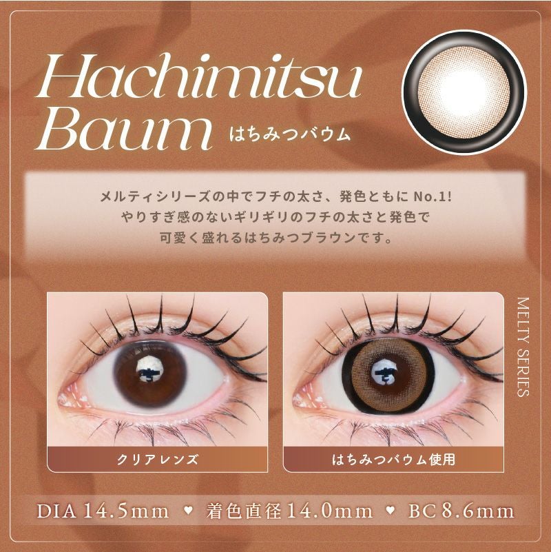 他の画像を見る 【即日発送OK♪】 LARME MELTY SERIES ラルムメルティシリーズ はちみつバウム(1箱10枚入り) 送料無料 即日発送 ネコポス UVカット うるおい成分 ナチュラル ハーフ瞳 色素薄い系 ブラウン 1day DIA14.5mm 着色直径14.0㎜以上 BC8.6mm 含水率58% フチあり 3箱同時購入で1箱分無料! 販売価格 ¥ 1,760 税込 カートに入れる お気に入りに登録する
