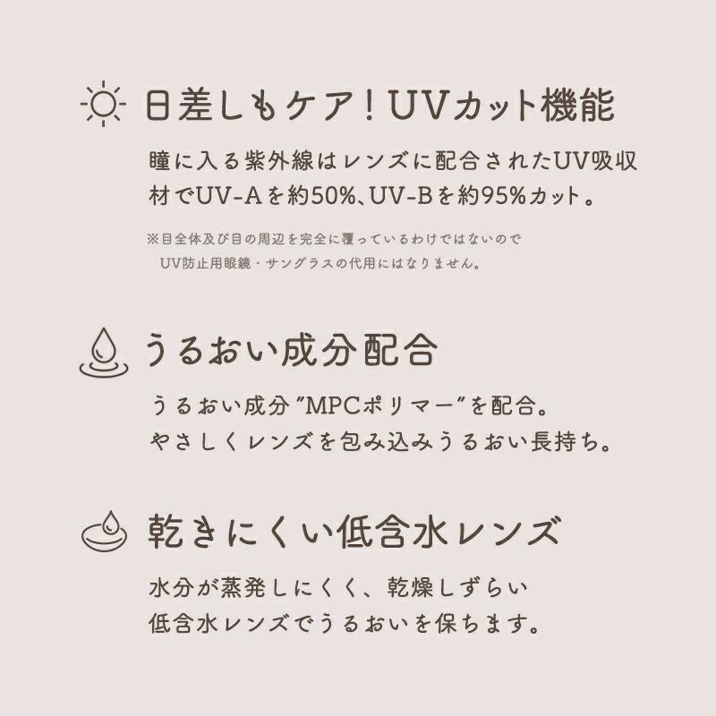 他の画像を見る 【即日発送OK♪】 LARME MELTY SERIES ラルムメルティシリーズ ベージュフィルター(1箱10枚入り) 送料無料 即日発送 ネコポス UVカット うるおい成分 ナチュラル ハーフ瞳 色素薄い系 水光 軸固定 ブラウン ベージュ グレー 1day DIA14.5mm 着色直径14.0㎜以上 BC8.7mm 含水率58% フチあり 3箱同時購入で1箱分無料! 販売価格 ¥ 1,760 税込 カートに入れる お気に入りに登録する