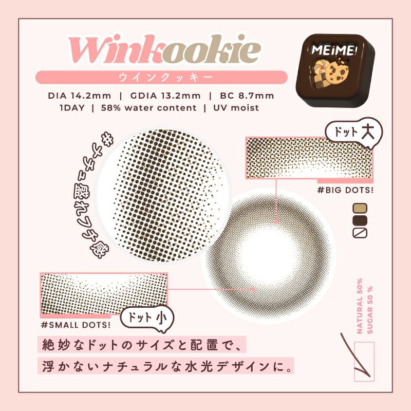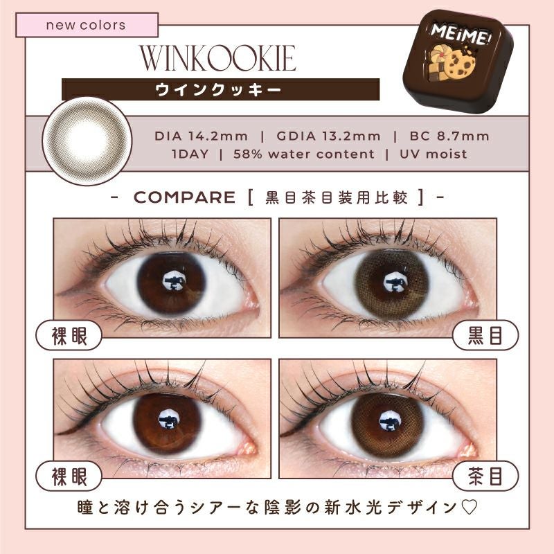 他の画像を見る 【即日発送OK♪】 MEiME! by LARME メイメ! by ラルム ウインクッキー (1箱10枚入り) 送料無料 即日発送 ネコポス UVカット うるおい成分 ナチュラル 色素薄い系 水光 ブラウン 1day DIA14.2mm 着色直径13.2㎜ BC8.7mm 含水率58% フチあり 3箱同時購入で1箱分無料! 販売価格 ¥ 1,760 税込 カートに入れる お気に入りに登録する