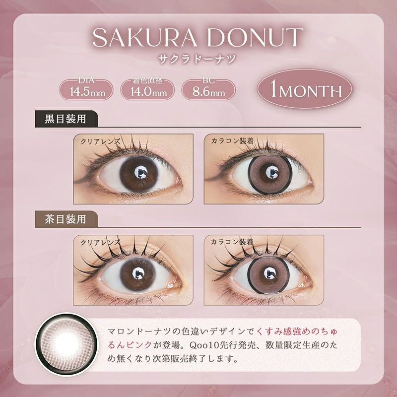 他の画像を見る 【即日発送OK♪】 《数量限定》LARME MELTY 1month ラルムメルティワンマンス サクラドーナツ(1箱2枚入り) 送料無料 即日発送 ネコポス UVカット うるおい成分 ハーフ瞳 色素薄い系 ブラウン ピンク 1ヶ月 DIA14.5mm 着色直径14.0㎜以上 BC8.6mm 含水率38% フチあり 販売価格 ¥ 1,650 税込 カートに入れる お気に入りに登録する