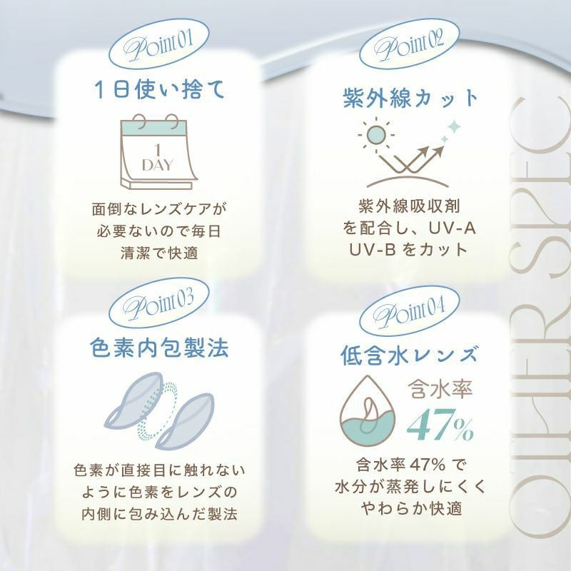 他の画像を見る 【即日発送OK♪】 azatome あざとめ シャンパウダー(1箱10枚入り) 送料無料 即日発送 ネコポス UVカット うるおい成分 ハーフ瞳 色素薄い系 グレー 1day DIA14.0mm 着色直径12.9㎜以下 BC8.7mm 含水率38% フチあり 3箱同時購入で1箱分無料! 販売価格 ¥ 1,760 税込 カートに入れる お気に入りに登録する