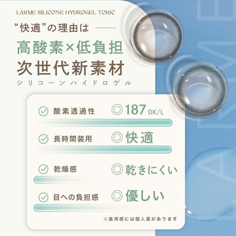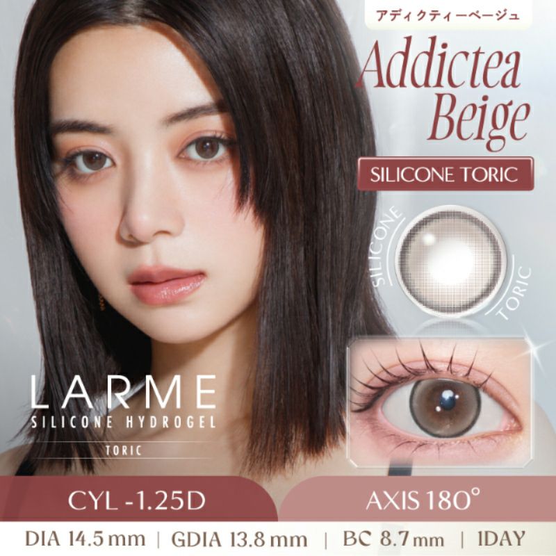 他の画像を見る 【即日発送OK♪】 【乱視用】LARME ラルムシリコンハイドロゲルトーリック アディクティーベージュ -1.25D/180°(1箱10枚入り) 送料無料 即日発送 ネコポス UVカット うるおい成分 シリコン 乱視用 ナチュラル ハーフ瞳 色素薄い系 ブラウン ベージュ 1day DIA14.5mm 着色直径13.8㎜ BC8.7mm 含水率47% フチあり 販売価格 ¥ 1,760 税込 カートに入れる お気に入りに登録する