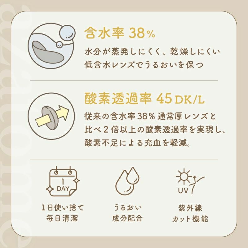 他の画像を見る 【即日発送OK♪】 azatome あざとめ ロールモデル(1箱10枚入り) 送料無料 即日発送 ネコポス UVカット うるおい成分 ハーフ瞳 色素薄い系 ブラウン ベージュ グレージュ 1day DIA14.0mm 着色直径12.9㎜以下 BC8.7mm 含水率38% フチあり 3箱同時購入で1箱分無料! 販売価格 ¥ 1,760 税込 カートに入れる お気に入りに登録する