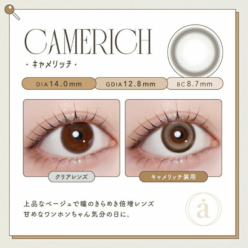 他の画像を見る 【即日発送OK♪】 azatome あざとめ キャメリッチ(1箱10枚入り) 送料無料 即日発送 ネコポス UVカット うるおい成分 ハーフ瞳 色素薄い系 ブラウン ベージュ 1day DIA14.0mm 着色直径12.9㎜以下 BC8.7mm 含水率38% フチあり 3箱同時購入で1箱分無料! 販売価格 ¥ 1,760 税込 カートに入れる お気に入りに登録する
