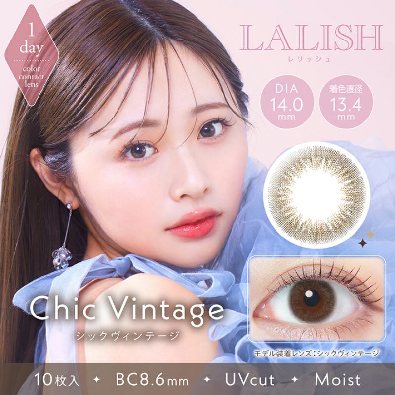 他の画像を見る 【即日発送NG】 LALISH レリッシュ シックヴィンテージ(1箱10枚入り) 送料無料 ネコポス UVカット うるおい成分 ナチュラル ブラウン 1day DIA14.0mm 着色直径13.4㎜ BC8.6mm 含水率42.5% フチあり 販売価格 ¥ 1,892 税込 カートに入れる お気に入りに登録する