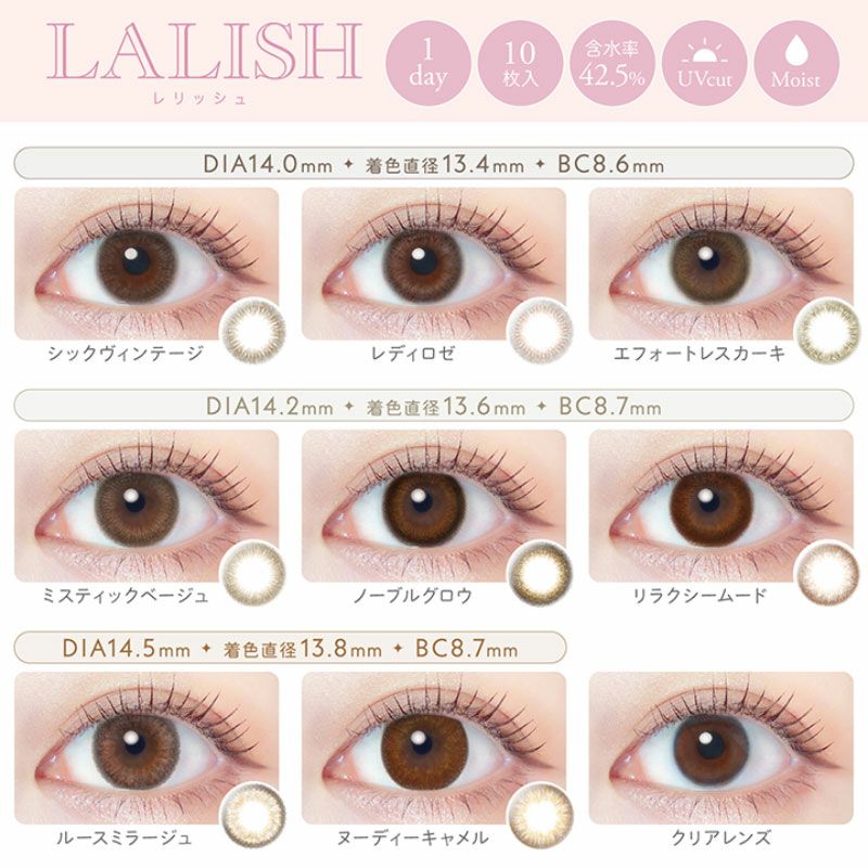 他の画像を見る 【即日発送NG】 LALISH レリッシュ レディロゼ(1箱10枚入り) 送料無料 ネコポス UVカット うるおい成分 ナチュラル ブラウン 1day DIA14.0mm 着色直径13.4㎜ BC8.6mm 含水率42.5% フチあり 販売価格 ¥ 1,892 税込 カートに入れる お気に入りに登録する