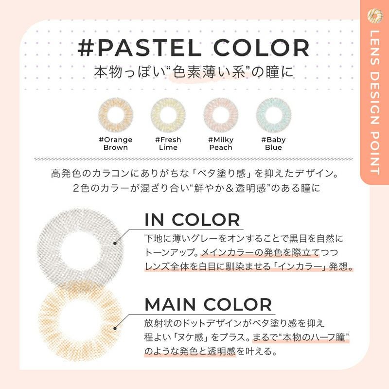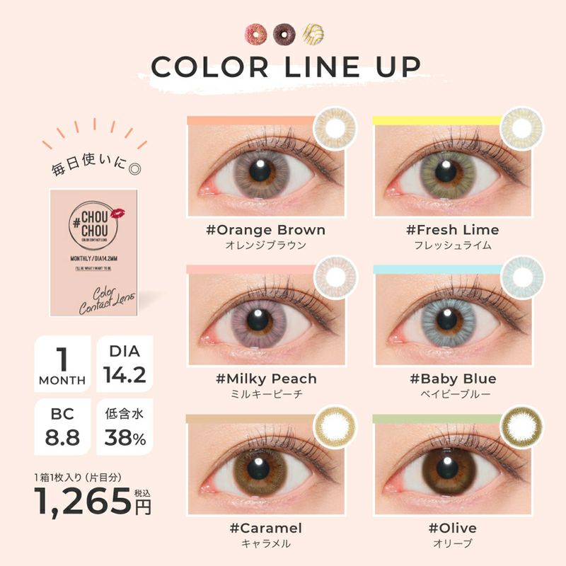 他の画像を見る 【即日発送NG】 #CHOUCHOU 1month チュチュ1マンス ミルキーピーチ(1箱1枚入り) 送料無料 ネコポス ハーフ瞳 ピンク 1ヶ月 DIA14.2mm BC8.8mm 含水率38% 販売価格 ¥ 1,265 税込 カートに入れる お気に入りに登録する