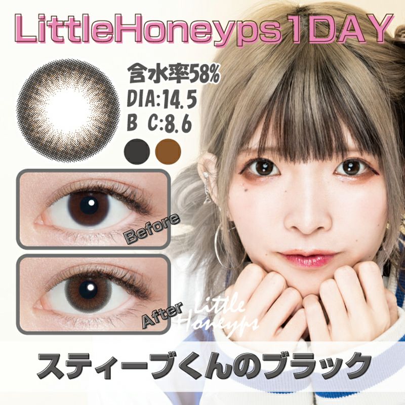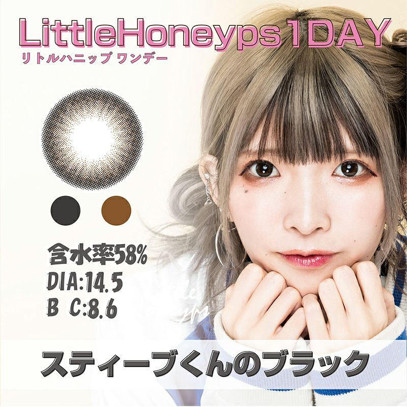 他の画像を見る 【在庫限りで終売】 LittleHoneyps1day リトルハニップワンデー スティーブくんのブラック(1箱10枚入り) 送料無料 即日発送 ネコポス UVカット うるおい成分 ナチュラル ブラック 1day DIA14.5mm 着色直径13.9㎜ BC8.6mm 含水率58% 販売価格 ¥ 1,320 税込 完売 カートに入れる お気に入りに登録する