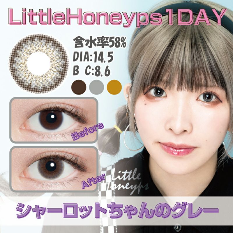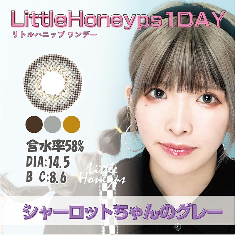 他の画像を見る 【在庫限りで終売】 LittleHoneyps1day リトルハニップワンデー シャーロットちゃんのグレー(1箱10枚入り) 送料無料 即日発送 ネコポス UVカット うるおい成分 ナチュラル グレー 1day DIA14.5mm 着色直径13.9㎜ BC8.6mm 含水率58% 販売価格 ¥ 1,320 税込 完売 カートに入れる お気に入りに登録する