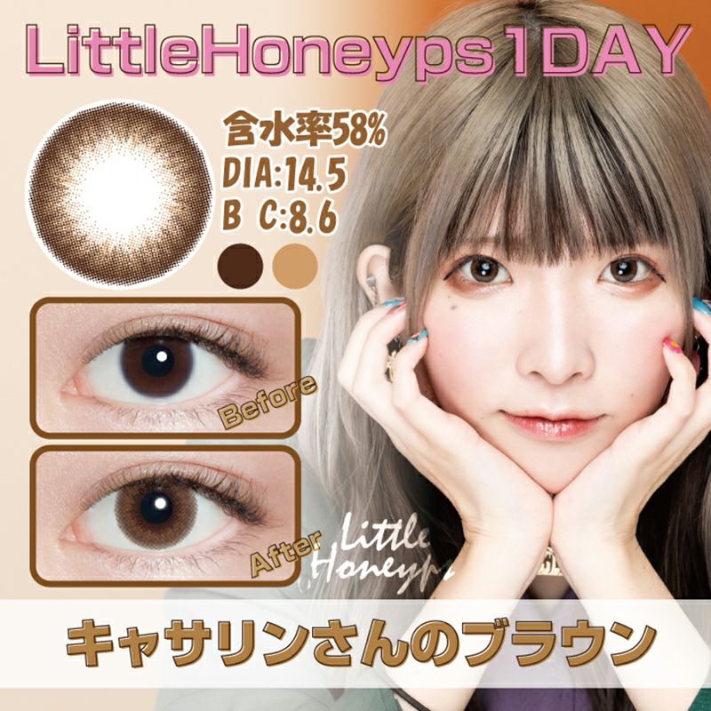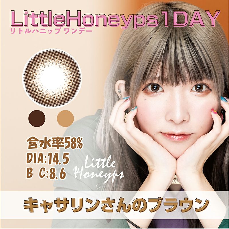 他の画像を見る 【在庫限りで終売】 LittleHoneyps1day リトルハニップワンデー キャサリンさんのブラウン(1箱10枚入り) 送料無料 即日発送 ネコポス UVカット うるおい成分 ナチュラル ブラウン 1day DIA14.5mm 着色直径13.9㎜ BC8.6mm 含水率58% 販売価格 ¥ 1,320 税込 完売 カートに入れる お気に入りに登録する