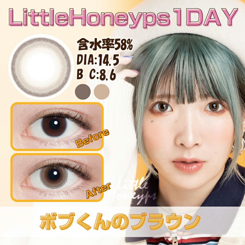 他の画像を見る 【在庫限りで終売】 LittleHoneyps1day リトルハニップワンデー ボブくんのブラウン(1箱10枚入り) 送料無料 ネコポス UVカット うるおい成分 ナチュラル ブラウン 1day DIA14.5mm 着色直径13.9㎜ BC8.6mm 含水率58% 販売価格 ¥ 1,320 税込 完売 カートに入れる お気に入りに登録する