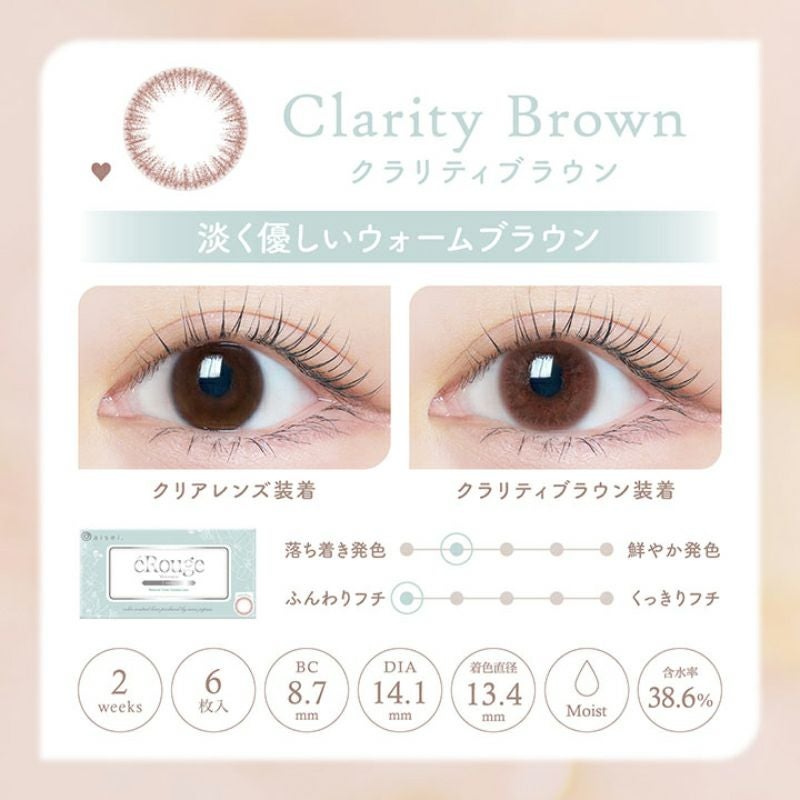 他の画像を見る 【即日発送OK♪】 eRouge エルージュ クラリティブラウン(1箱6枚入り) 送料無料 即日発送 ネコポス うるおい成分 ナチュラル ブラウン 2week DIA14.1mm 着色直径13.4㎜ BC8.7mm 含水率38.6% 販売価格 ¥ 2,640 税込 カートに入れる お気に入りに登録する