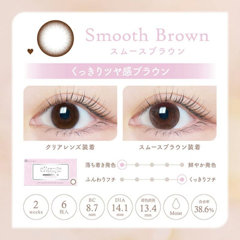 他の画像を見る 【即日発送OK♪】 eRouge エルージュ スムースブラウン(1箱6枚入り) 送料無料 即日発送 ネコポス うるおい成分 ナチュラル ブラウン 2week DIA14.1mm 着色直径13.4㎜ BC8.7mm 含水率38.6% フチあり 販売価格 ¥ 2,640 税込 カートに入れる お気に入りに登録する