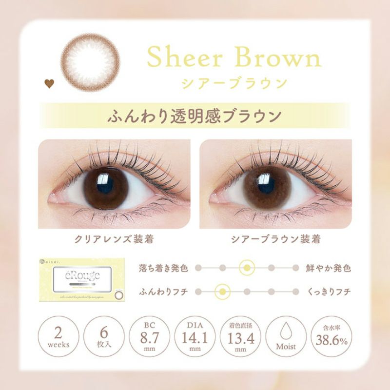 他の画像を見る 【即日発送OK♪】 eRouge エルージュ シアーブラウン(1箱6枚入り) 送料無料 即日発送 ネコポス うるおい成分 ナチュラル ブラウン 2week DIA14.1mm 着色直径13.4㎜ BC8.7mm 含水率38.6% フチあり 販売価格 ¥ 2,640 税込 カートに入れる お気に入りに登録する