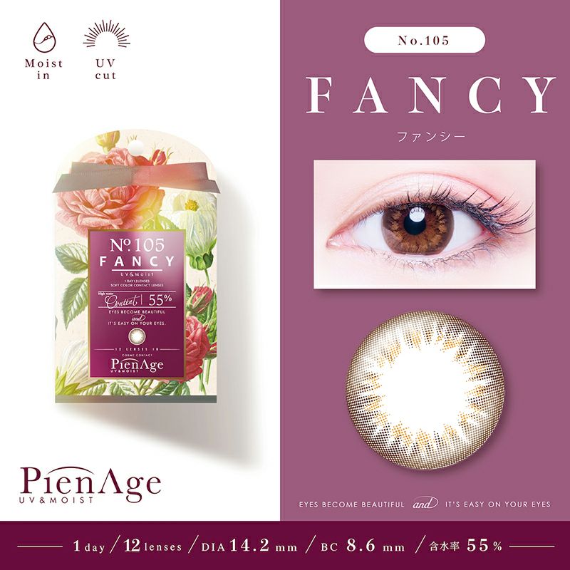 他の画像を見る 【即日発送NG】 PienAge ピエナージュ55% UV&MOIST NO.105 ファンシー(1箱12枚入り) 送料無料 ネコポス UVカット うるおい成分 ナチュラル ハーフ瞳 ブラウン 1day DIA14.2mm 着色直径13.6㎜ BC8.6mm 含水率55% フチあり 販売価格 ¥ 1,760 税込 カートに入れる お気に入りに登録する