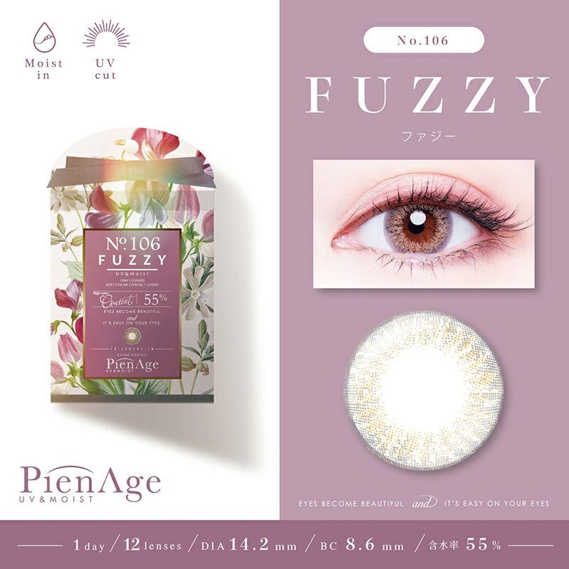 他の画像を見る 【即日発送NG】 PienAge ピエナージュ55% UV&MOIST NO.106 ファジー(1箱12枚入り) 送料無料 ネコポス UVカット うるおい成分 ハーフ瞳 グレー 1day DIA14.2mm 着色直径13.6㎜ BC8.6mm 含水率55% フチあり 販売価格 ¥ 1,760 税込 カートに入れる お気に入りに登録する