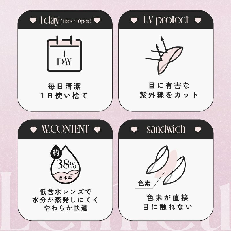 他の画像を見る 【即日発送NG】 Lemieu ルミュー グラスローズ(1箱10枚) 送料無料 ネコポス UVカット ナチュラル ピンク 1day DIA14.2mm 着色直径13.2㎜ BC8.6mm 含水率38.5% フチあり 1箱から超得! 販売価格 ¥ 1,705 税込 カートに入れる お気に入りに登録する