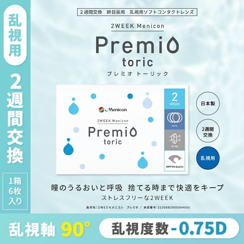 他の画像を見る 【即日発送NG】 【乱視用】2WEEK Menicon Premio toric ツーウィークメニコンプレミオトーリック -0.75D/90°(1箱6枚入り) 送料無料 ネコポス 乱視用 クリアレンズ 度ありのみ 2week DIA14.0mm BC8.6mm 含水率40% 販売価格 ¥ 2,310 税込 カートに入れる お気に入りに登録する